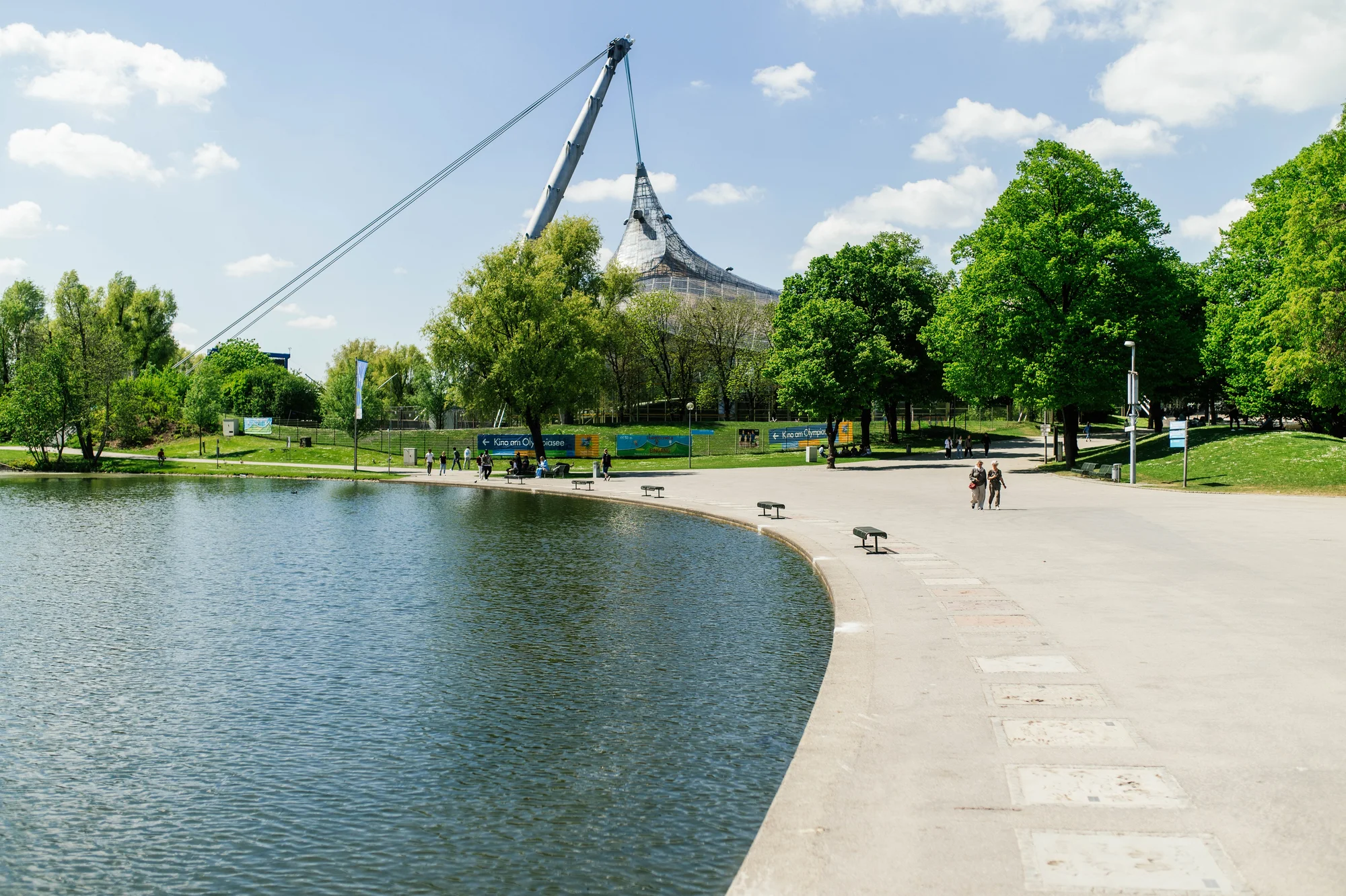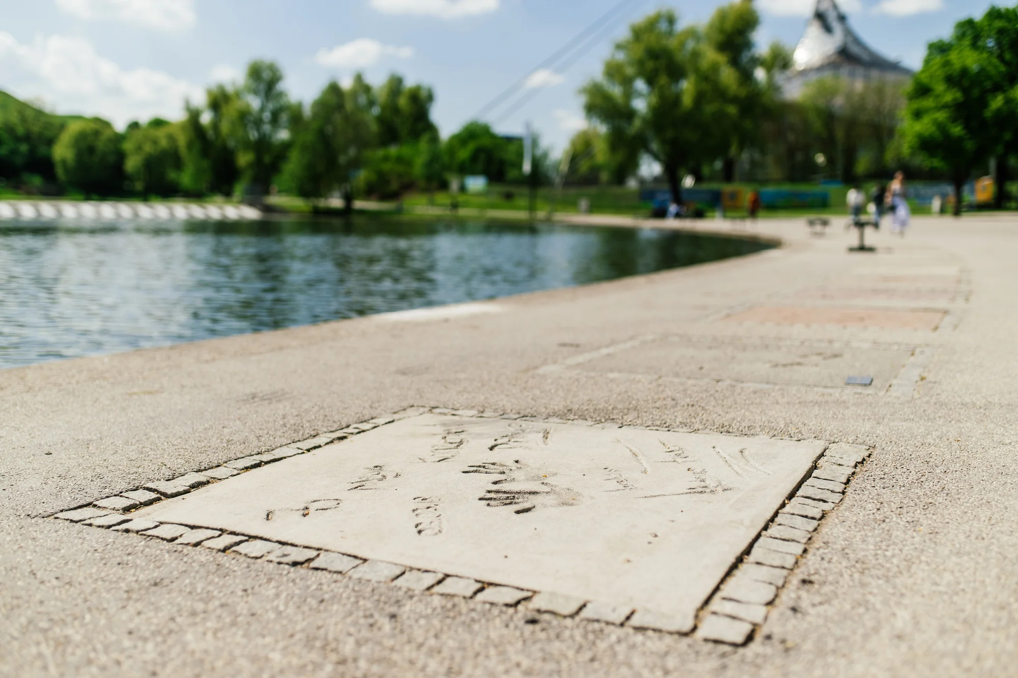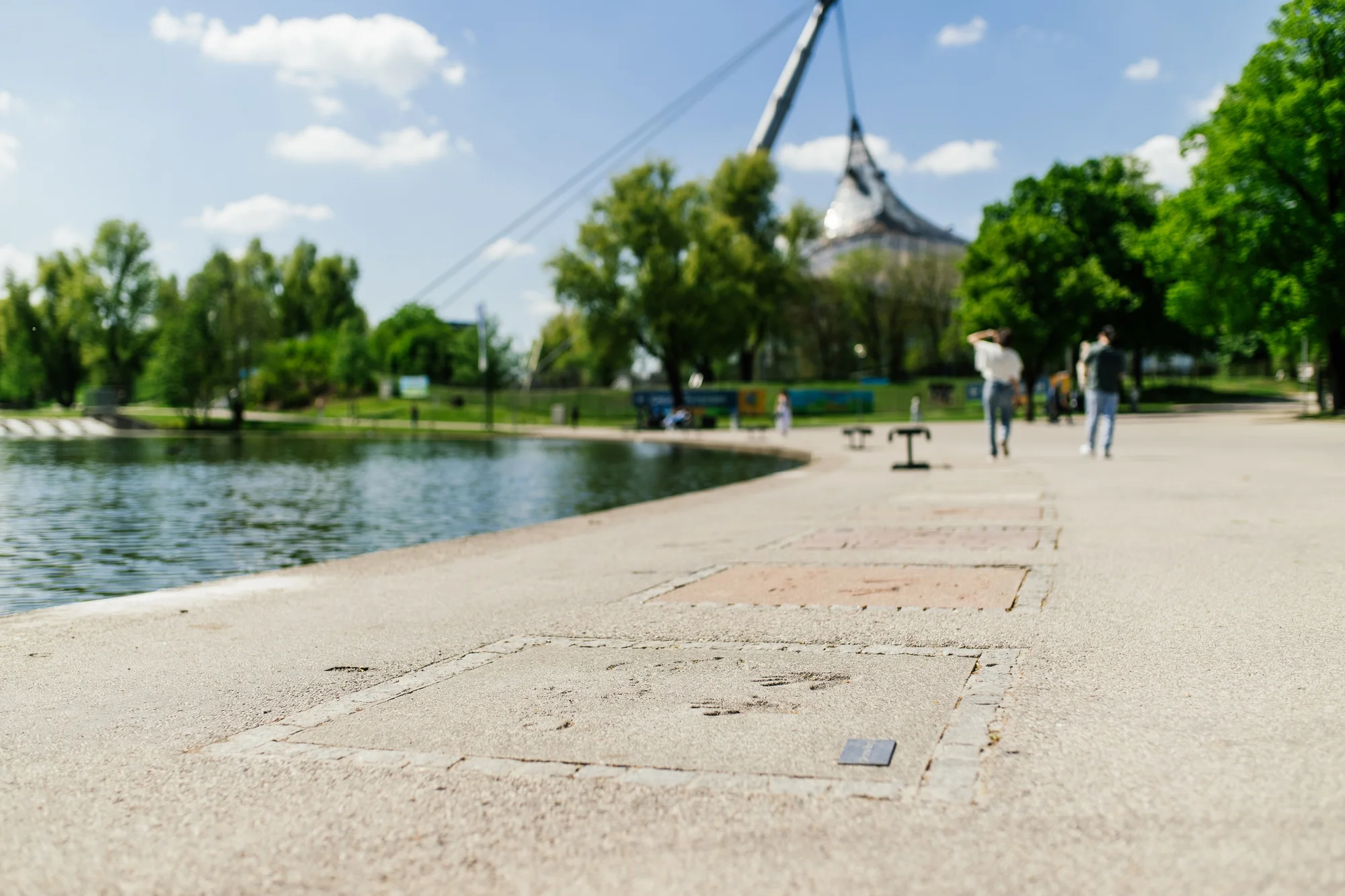 Die harten Fakten liegen also auf 800 Meter Länge entlang des Olympiasees am Fuße des Olympiaturms. In die 90x90 cm-Platten wurden bislang über 6100 kg Zement gegossen und 85 qm Stahlgitter eingesetzt. Schließlich wurden die 76 Platten mit 610 Liter Speziallack überzogen, damit sie Wind und Wetter besser standhalten.