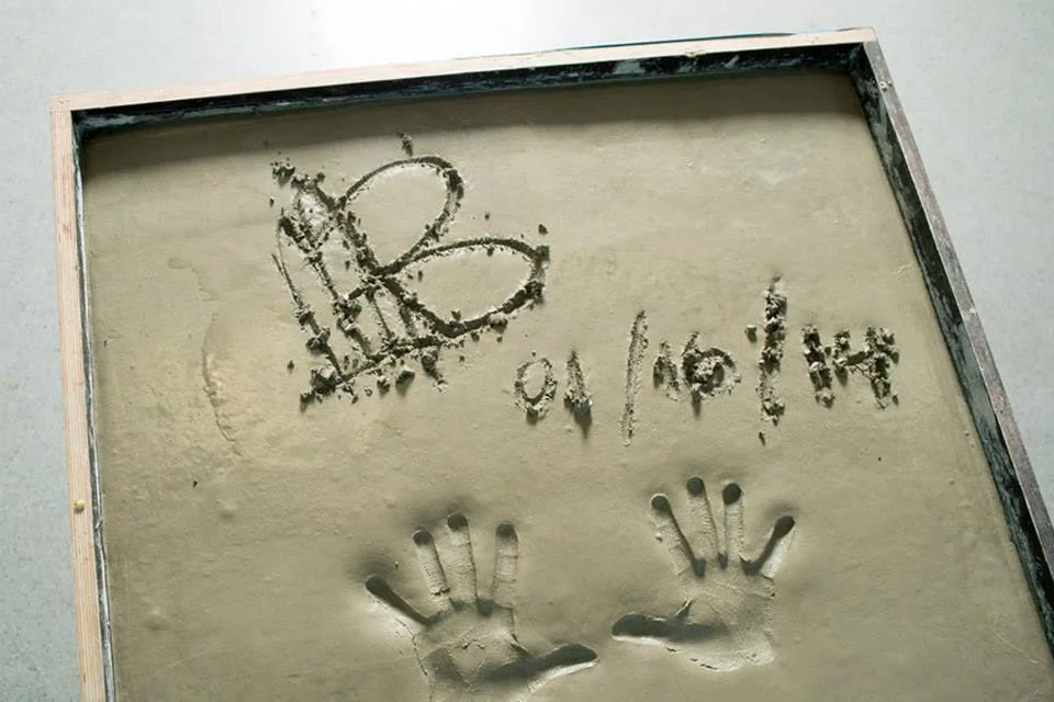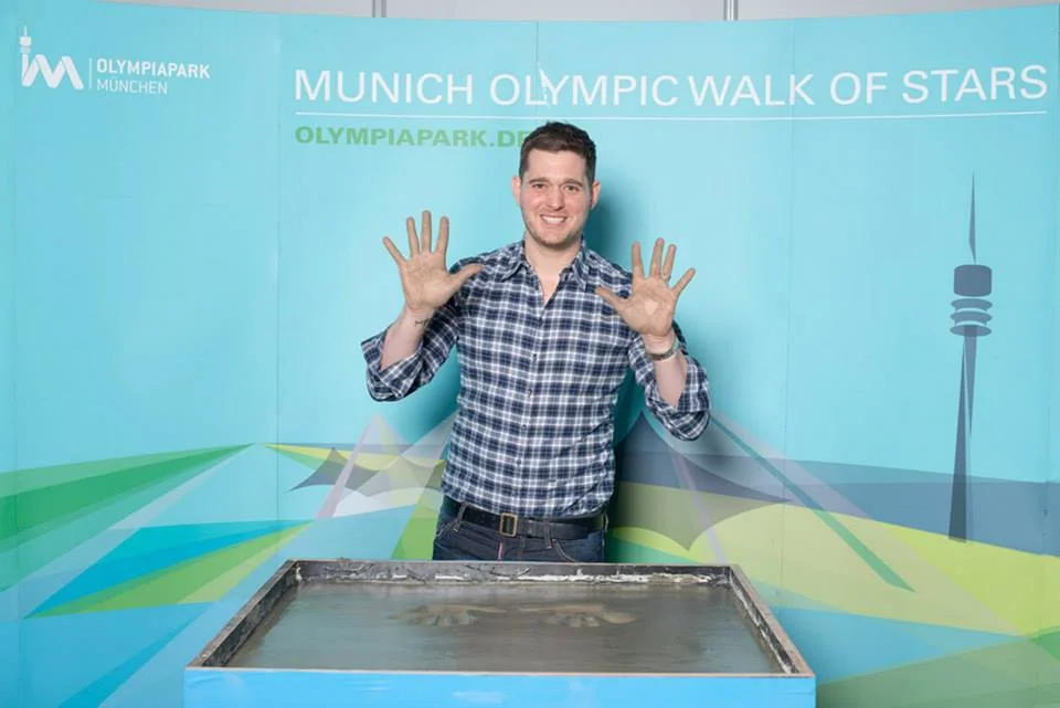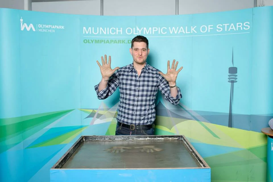 Mit Smoking an der Betonkiste wär´ natürlich auch ein reizvolles Bild gewesen, aber die klassische Abendbekleidung für den Herren hat Michael Bublé dann doch in der Garderobe gelassen. Im Gegensatz zu seinen guten Manieren, die sind auch beim Handabdruck mit von der Partie. Höflich begrüßt er alle Beteiligten und freut sich über die Ehre, die ihm zuteil wird.