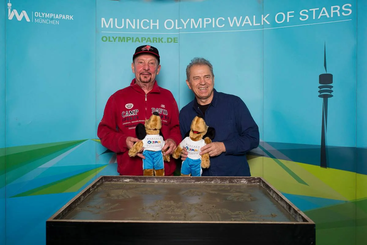 Am Tag vor dem Jubiläumskonzert zum 40-jährigen Bestehen der Spider Murphy Gang in der Olympiahalle hinterließ das Front-Duo der legendären Münchner Kultband seine Abdrücke im Olympiapark. Sigl und Murphy, der mit bürgerlichem Namen als Gerhard Gmell auf die Welt kam, schrieben nicht nur ihre Namen in den Zement, sie schrieben für zwei Fans auch Autogramme auf alte Schallplatten-Cover.