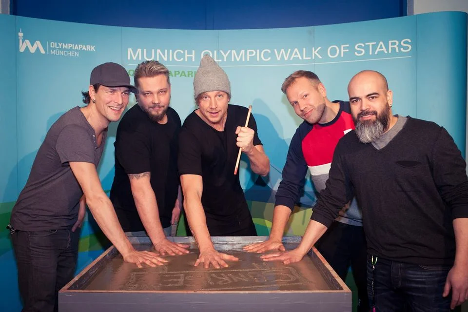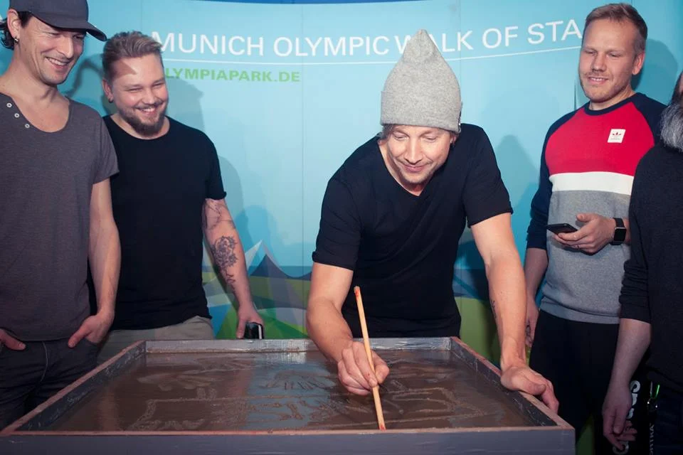 Noch bevor sich alle um die Platte sortiert und aufgestellt hatten, beugte sich Bandfrontmann und „The Voice“-Juror Samu Haber spaßeshalber direkt mit seinem Gesicht über den frisch zubereiteten Zement – aber er wollte dann doch lieber seine Hände verewigen anstatt Augen, Mund und Nase – wäre aber sicherlich sehr lustig gewesen.