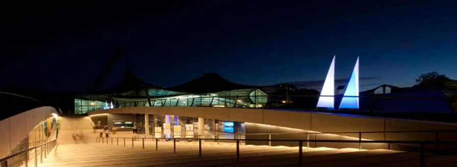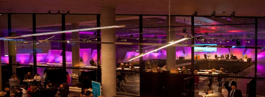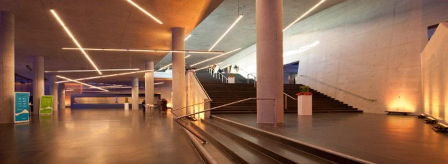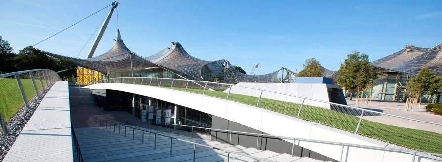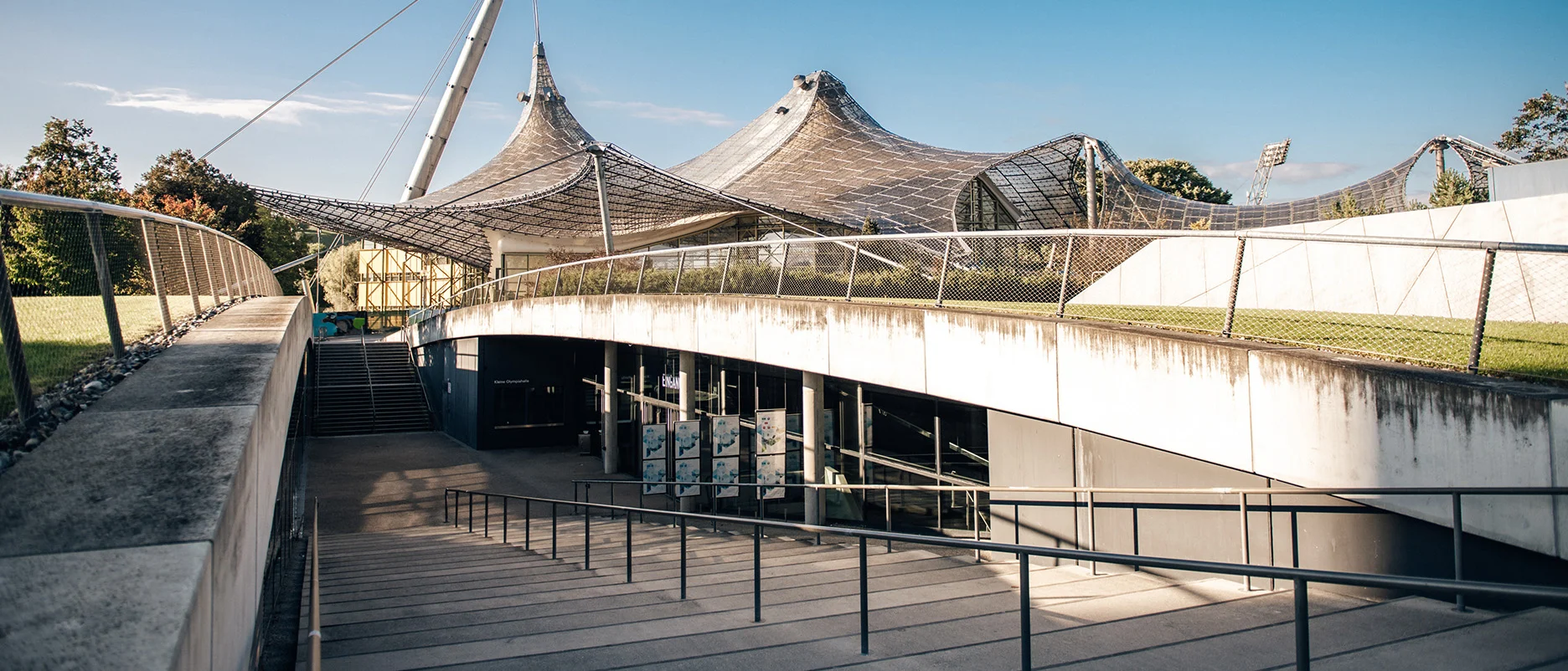 Ein wenig verborgen liegt sie da, zwischen Lillian-Board-Weg und Luz-Long-Ufer. Unscheinbar eingebettet in die zauberhafte Parklandschaft unter sanften Wiesen und Grünflächen: zwei sanft geschwungene Betonbögen weisen den Weg hinab in den Untergrund, in die vom Münchner Architektenbüro Auer + Weber entworfene Kleine Olympiahalle, die sich neben ihrer großen Schwester, der Großen Olympiahalle, seit ihrer Eröffnung 2011 bereits sehr schnell als begehrter Veranstaltungsort und als feste Größe im Olympiapark etabliert hat.