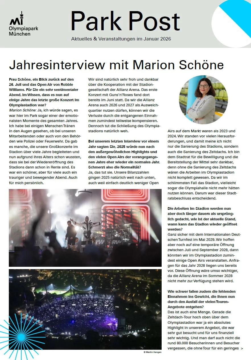 Der Olympiapark informiert mit den Ausgaben Januar bis Dezember 2026 der PARK POST