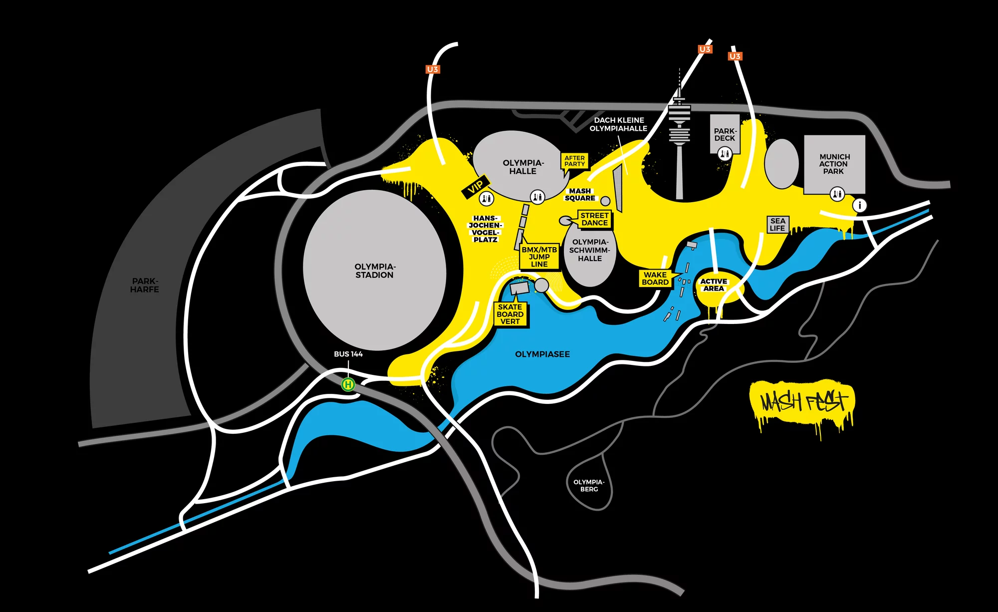 Das allein ist schon groß und spektakulär. Aber MASH ist sehr viel mehr als ein “einfacher” Sport-Event. Das legendäre MASH Fest ist das Herz des Events, hier fühlt man den Puls der Szene. Sport, Kunst, Kultur und Kreativität verschmelzen zu einem einzigartigen Erlebnis - und dies in der beeindruckenden Kulisse des Olympiaparks. Ob auf der Mini Ramp am MASH Square, in den Chill-Out Areas oder Open Spaces – das MASH Fest lädt alle Besucher:innen, alt und jung zum Mitmachen, Verweilen und Entspannen ein.