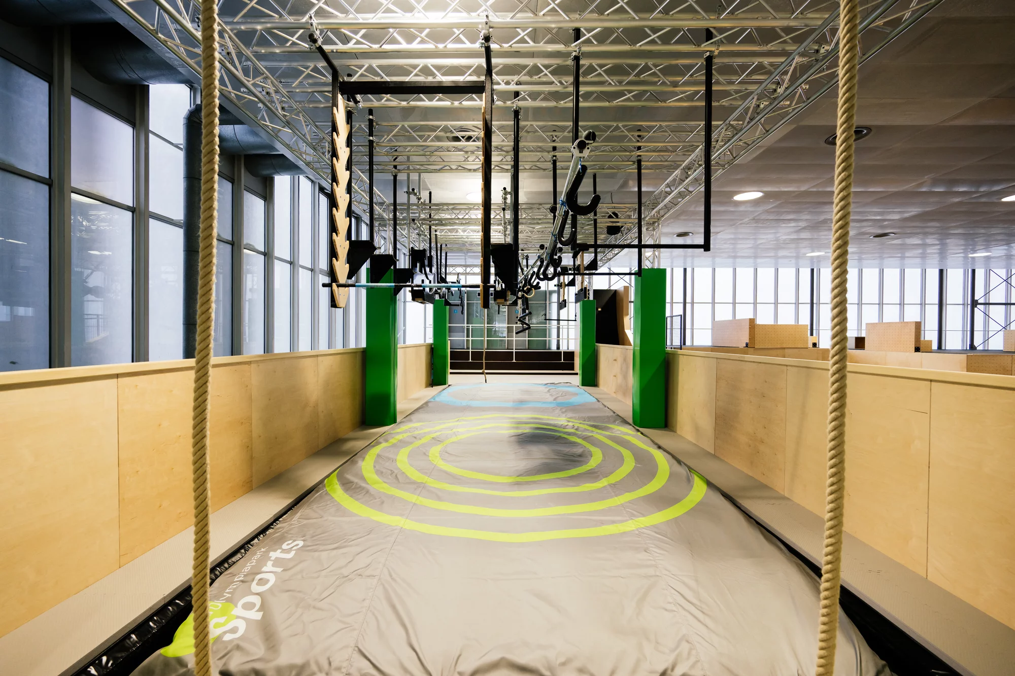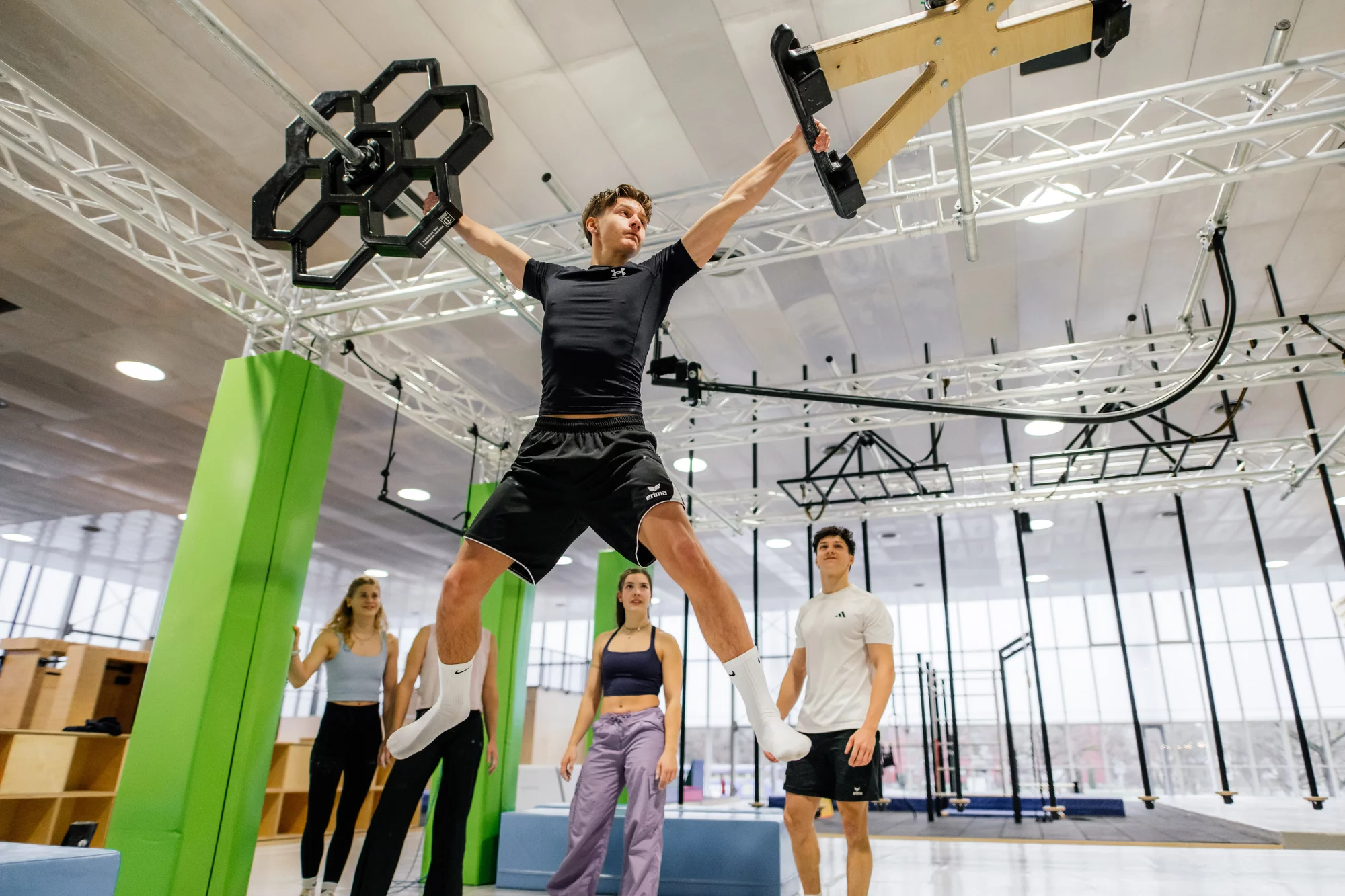 Sobald die Füße den Boden verlassen, beginnt die eigentliche Arbeit. Ringe, Taue, Stangen und Kugeln fordern Deine Unterarme heraus. Die Abstände variieren, sodass Du lernen musst, Schwung ("Laché") zu generieren, um weite Distanzen zu überbrücken.