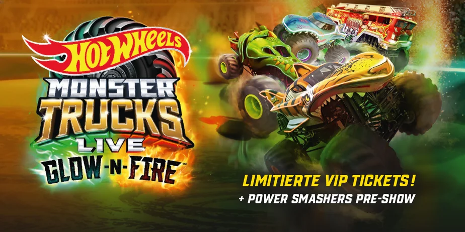 Nun gibt es die motorisierten Ungetüme aber nicht nur in kleiner Modellversion fürs Kinderzimmer, sondern natürlich auch in Originalgröße für die großen Arenen dieser Welt. Sorgten sie bei der Glow-Party mit beeindruckenden Lichteffekten im Dunkeln noch für Aufsehen, setzen die Hot Wheels Monster Trucks nun noch eins drauf. So verspricht die Glow-N-Fire-Tour zusätzlich spektakuläre Pyroeffekte. Mit dabei ist natürlich auch Bigfoot, der wohl prominenteste Vertreter der Monster-Truck-Spezies – sowie als Neuzugang auch der eher ungemütlich in Erscheinung tretende Skelesaurus. Ein besonderes Schmankerl bei allen drei Shows an beiden Tagen ist die Power Smashers Pre-Show Party, bei der die Fans die Gelegenheit haben, die Trucks aus nächster Nähe zu bestaunen und sich von ihren Lieblingsfahrern Autogramme zu holen.