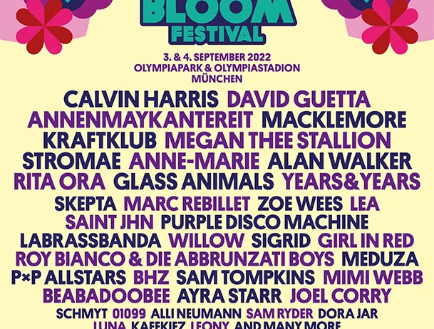 Jetzt wird das Line-Up um zahlreiche Megastars ergänzt. Es gibt gleich drei Auftritte, die in Deutschland exklusiv sind: Sowohl der britische DJ, Sänger, Songwriter und Produzent Calvin Harris, der mit seinen zahlreichen Song-Kollaborationen schon viele Charthits landete, als auch der amerikanischen Rapper Macklemore und Will Smith's Tochter Willow spielen auf dem SUPERBLOOM in München ihr einziges Deutschlandkonzert. Die US-Rapperin Megan Thee Stallion, deren Raps messerscharf sind und der britische Grime-Superstar Skepta hingegen geben in München ihr Debüt. Geballte Frauenpower kommt mit den UK Sängerinnen Rita Ora und Mimi Webb sowie Schauspielerin und Sängerin Alli Neumann. Auch die mittlerweile Ein-Mann Band Years & Years um Sänger Olly Alexander – eines der heißesten Comebacks des Jahres – und Newcomer der Deutschrapszene Schmyt, gehören zu den bestätigten Acts.