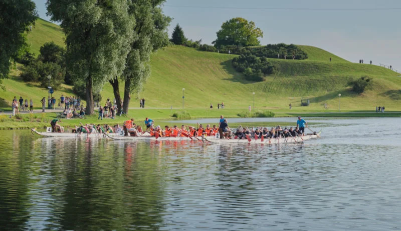 Before the final at around 19:30, there is the LMU vs TU professors' race for the title of ‘Master of the Olympic Lake Professors’. After that comes the final and the fastest team can rightly call themselves ‘Master of the Olympic Lake’.