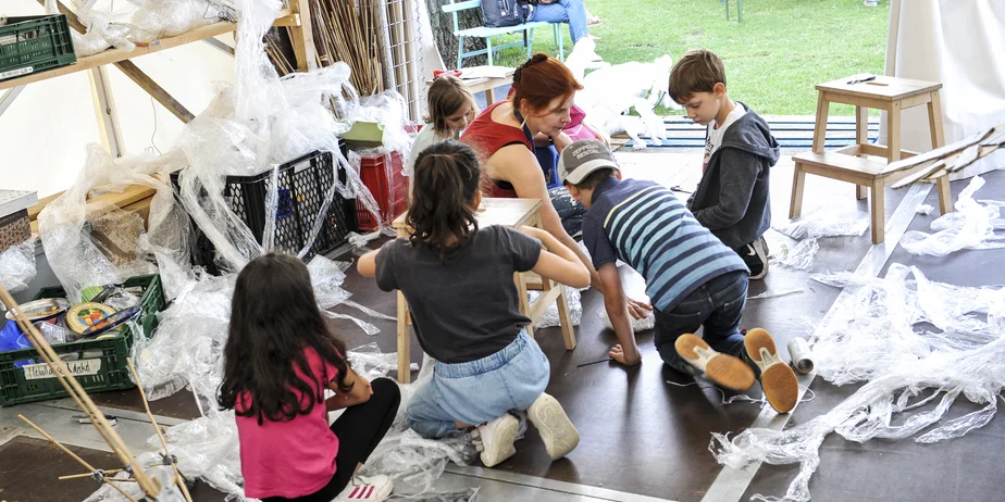 The more than 20 different workshops and studios each start with their own project: photographing, filming, building, modelling, tailoring, selling, recording sounds, researching, experimenting, strolling, reading, writing, drawing, painting, planting, watering, digging, landing nets, looking at the stars. Constructions, objects, media productions, things and games are created - a temporary art space where in the end everything is connected to everything else.