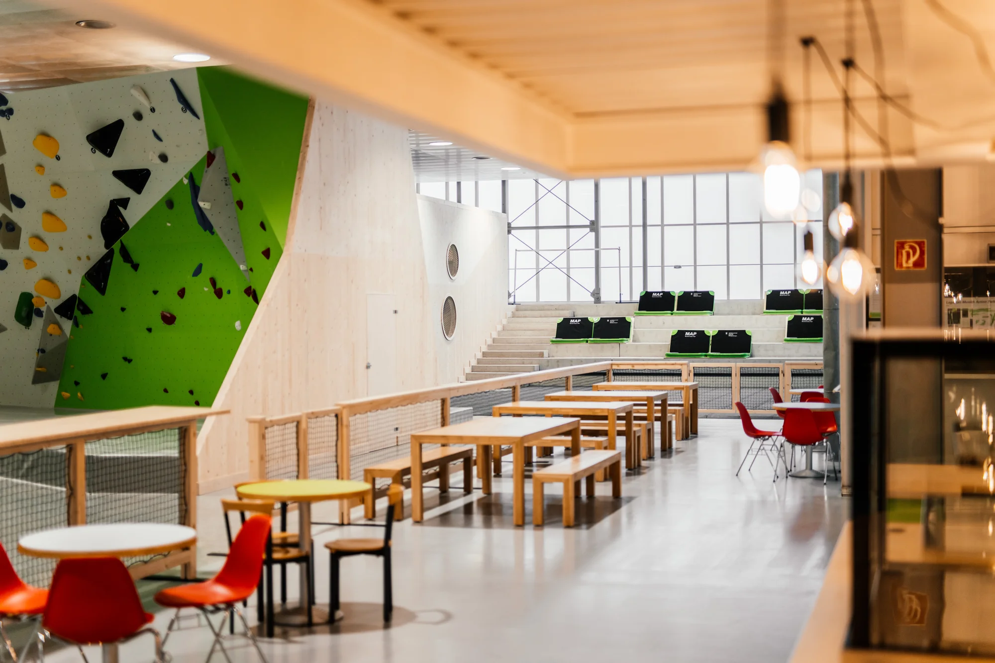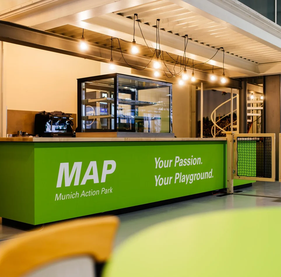 You can enter the bistro even without a ticket. This makes it perfect for accompanying persons, families or anyone who wants to experience the atmosphere at Munich Action Park without training themselves.