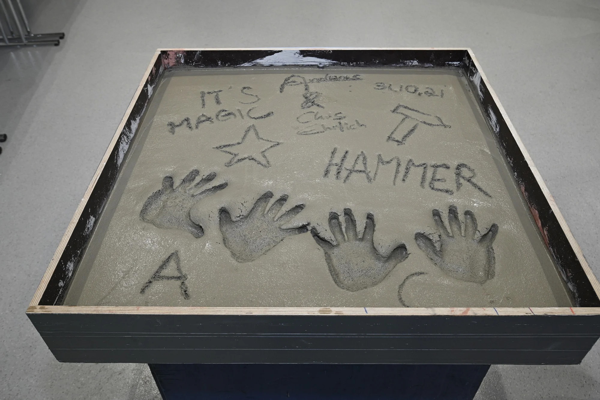 They left their mark with four hands in the liquid concrete, added impressions of a star and a hammer and signed with their initials A and C.